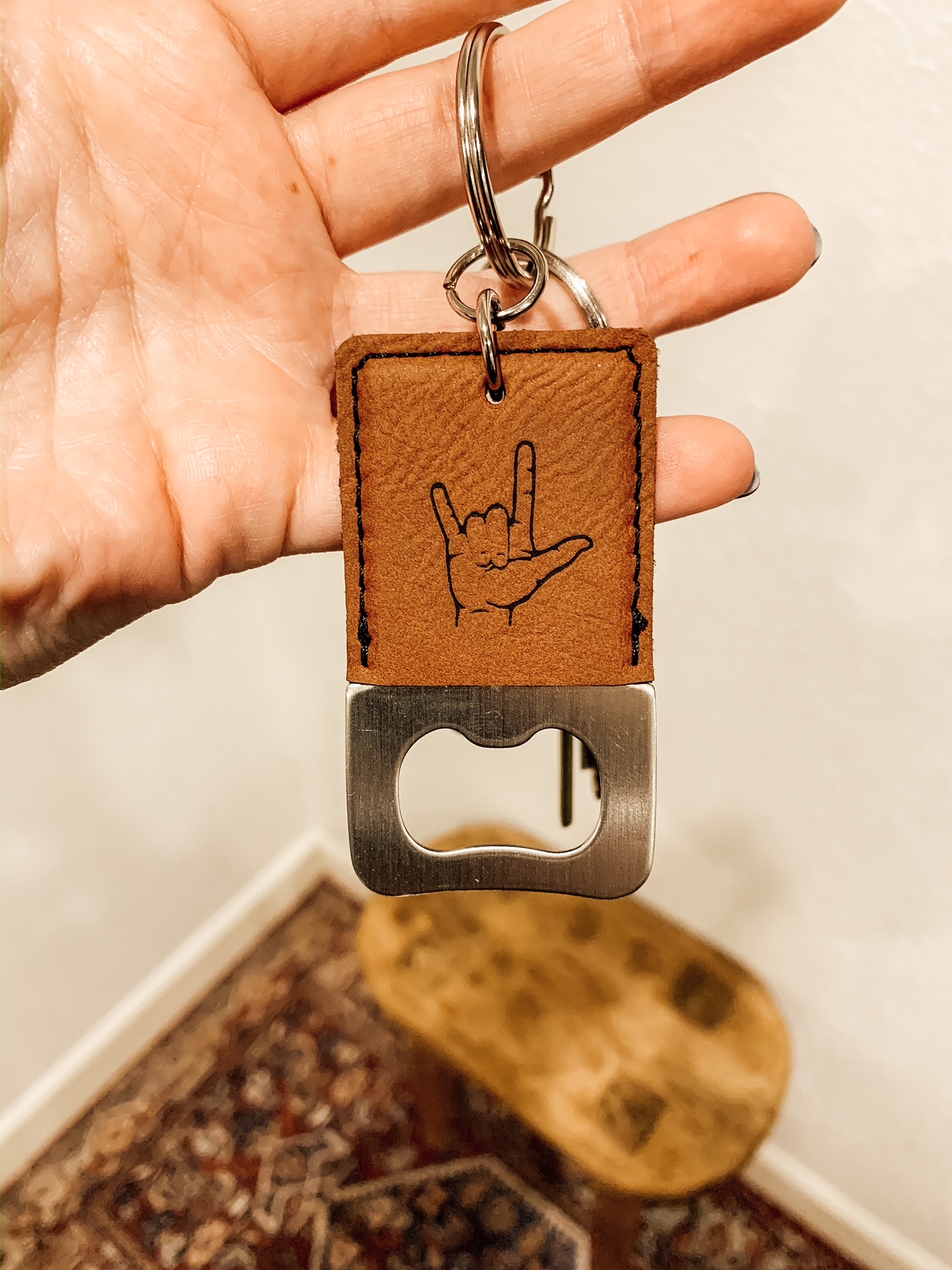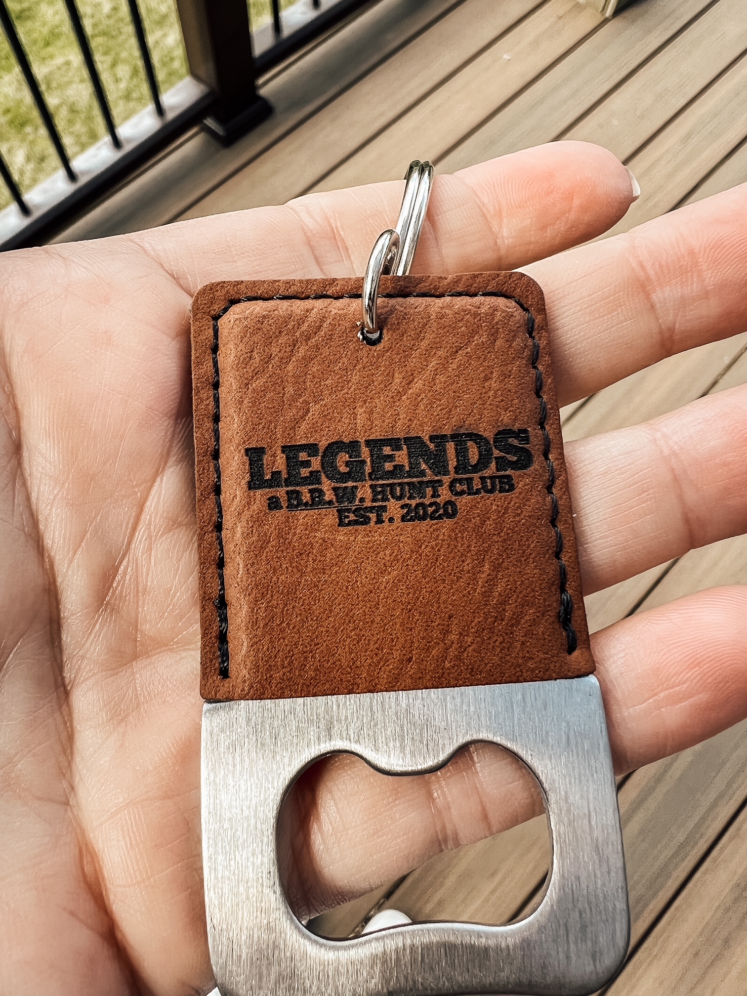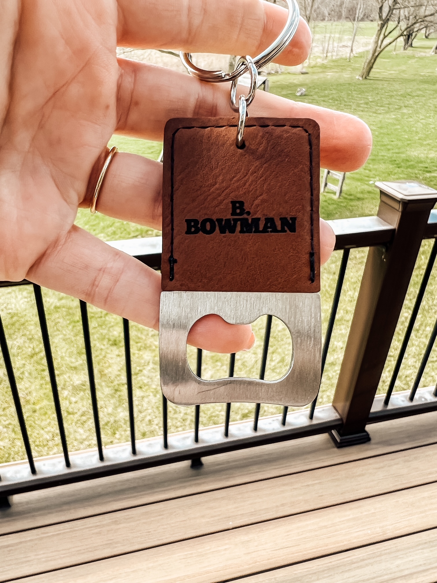 Leatherette bottle opener rectangle keychain. This richly textured, synthetic material is water resistant, easy to clean and durable enough for the rigors of daily use.