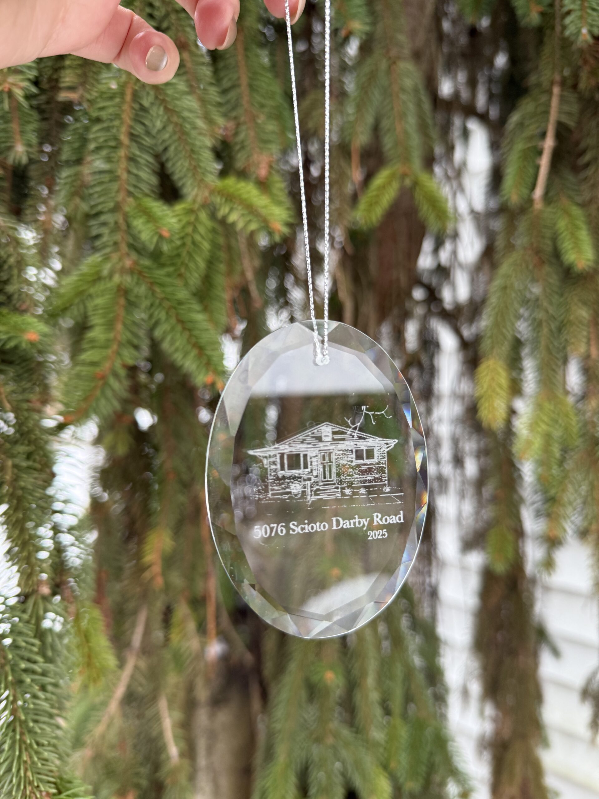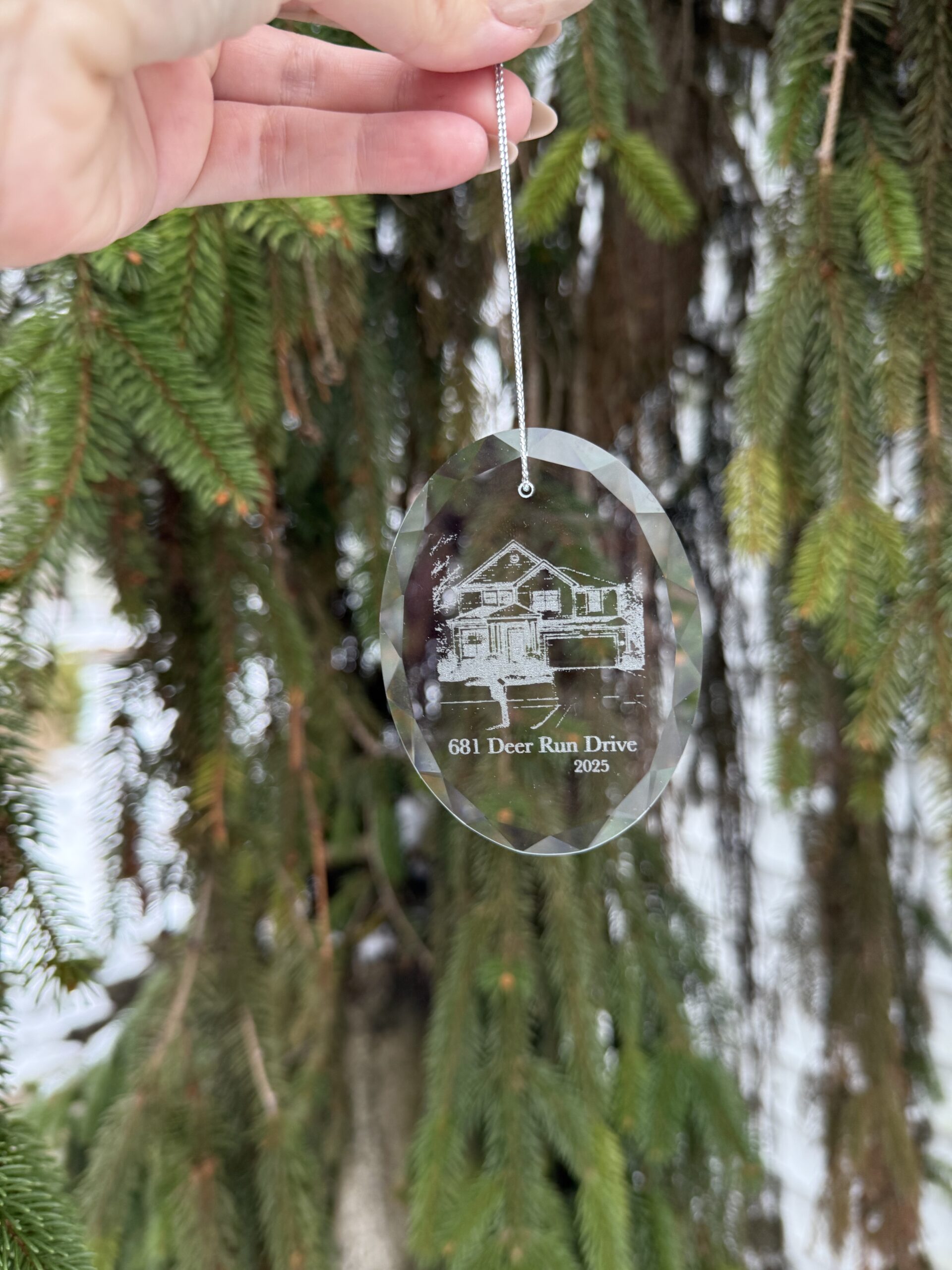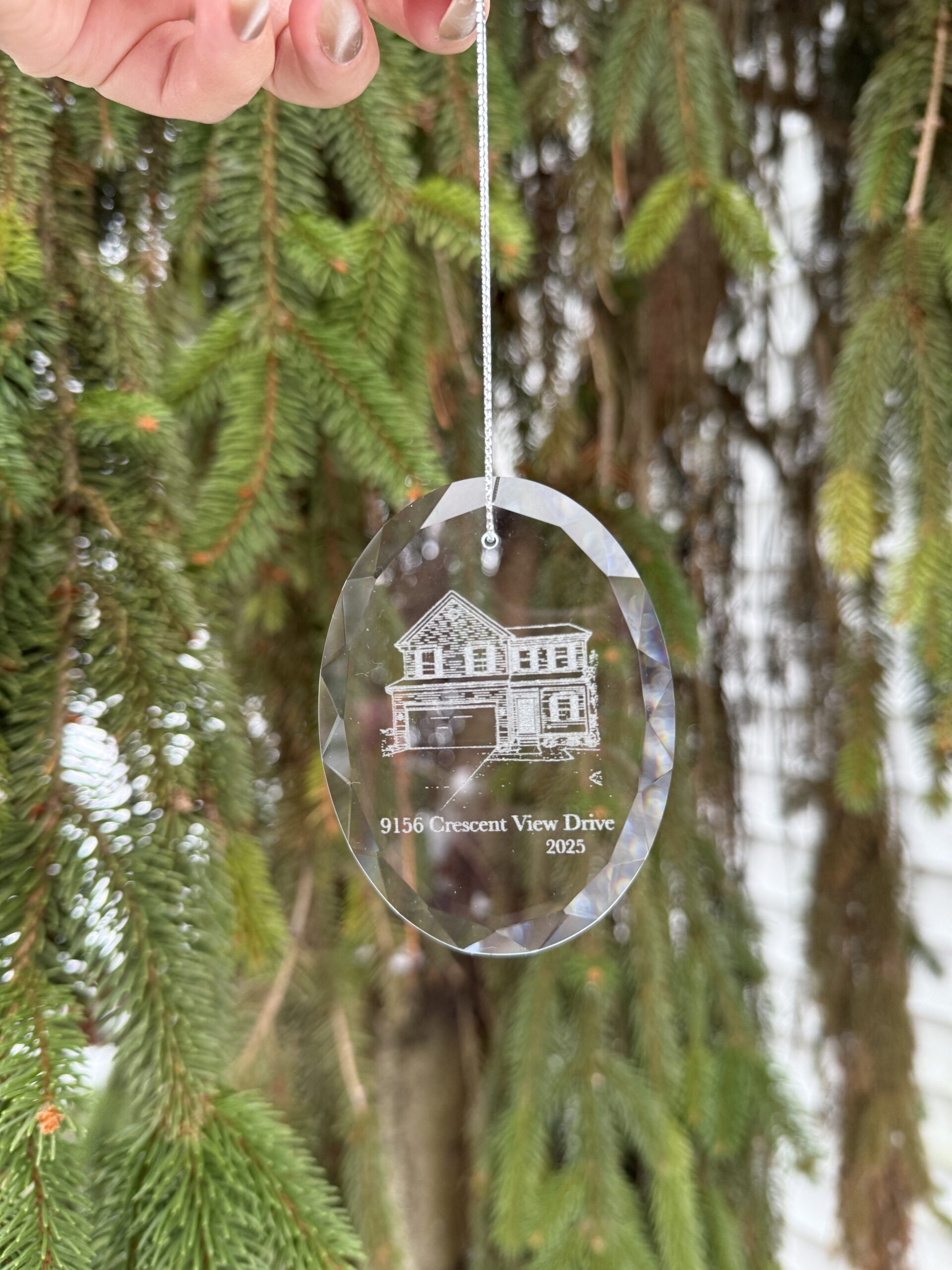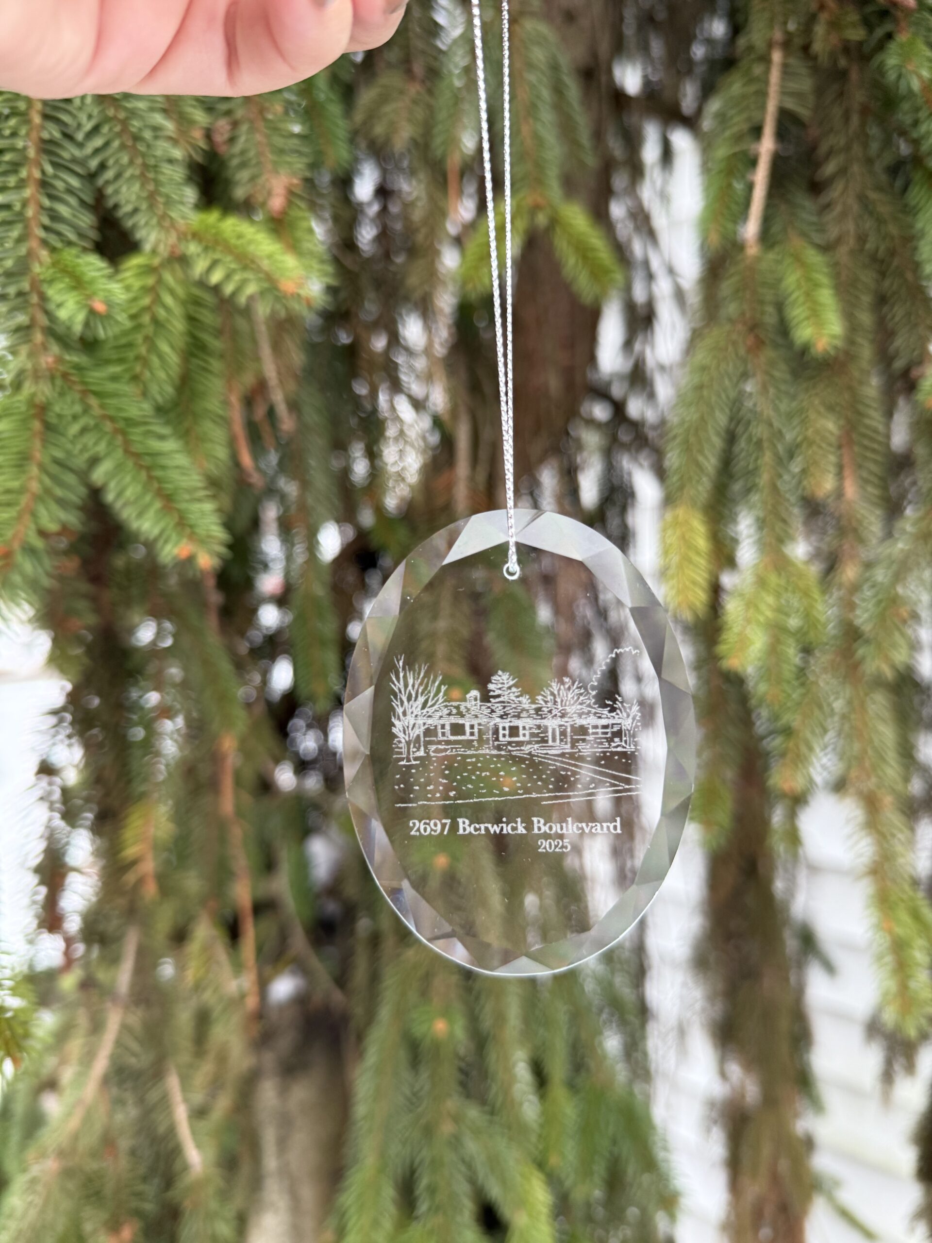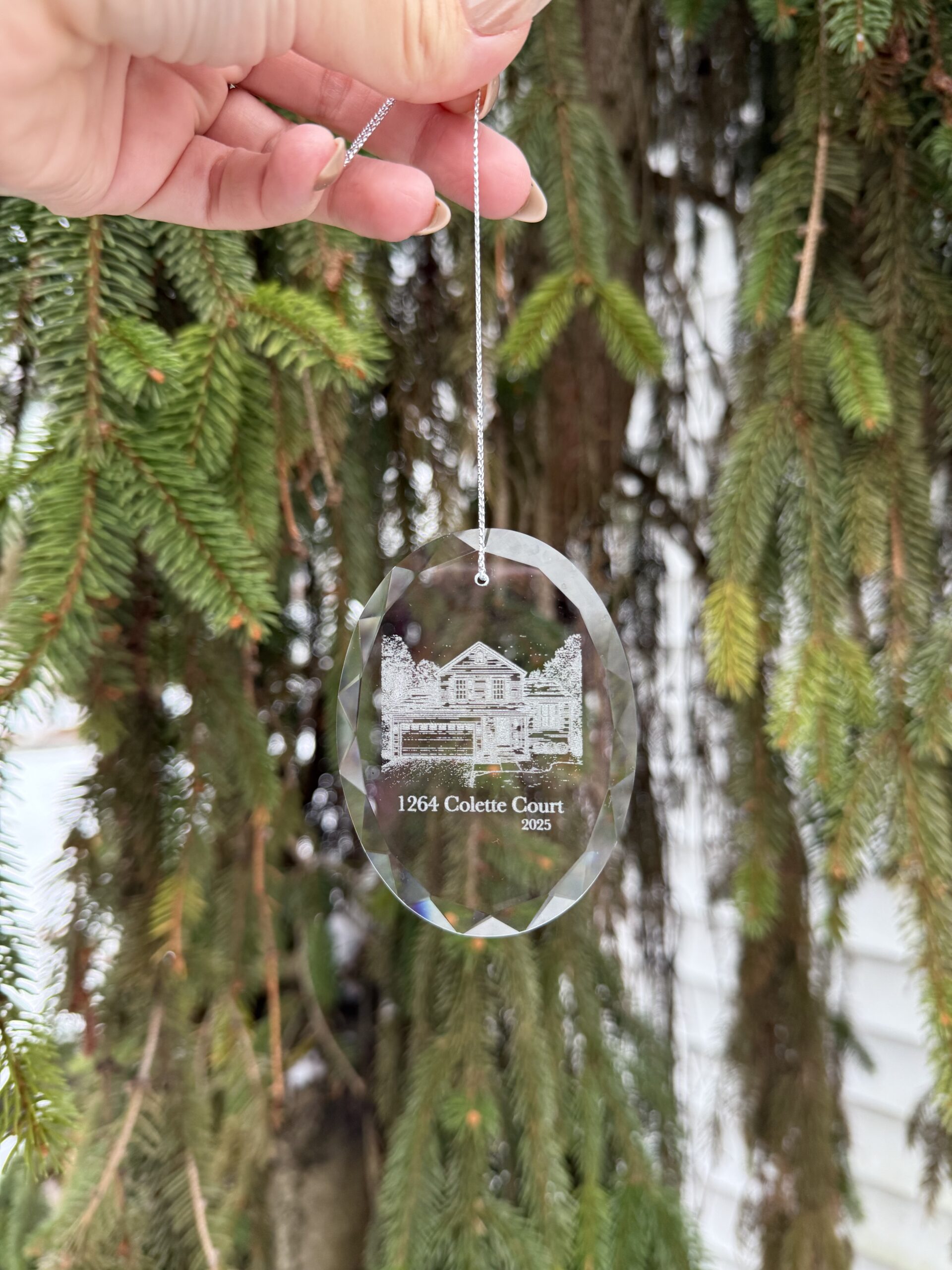 Oval glass ornament. 3″ tall. Upload a picture of your home and anything else you want added (address, name, year, etc.) This is the perfect heirloom piece to gift to a new home owner or as a keepsake to remember your home over the years.