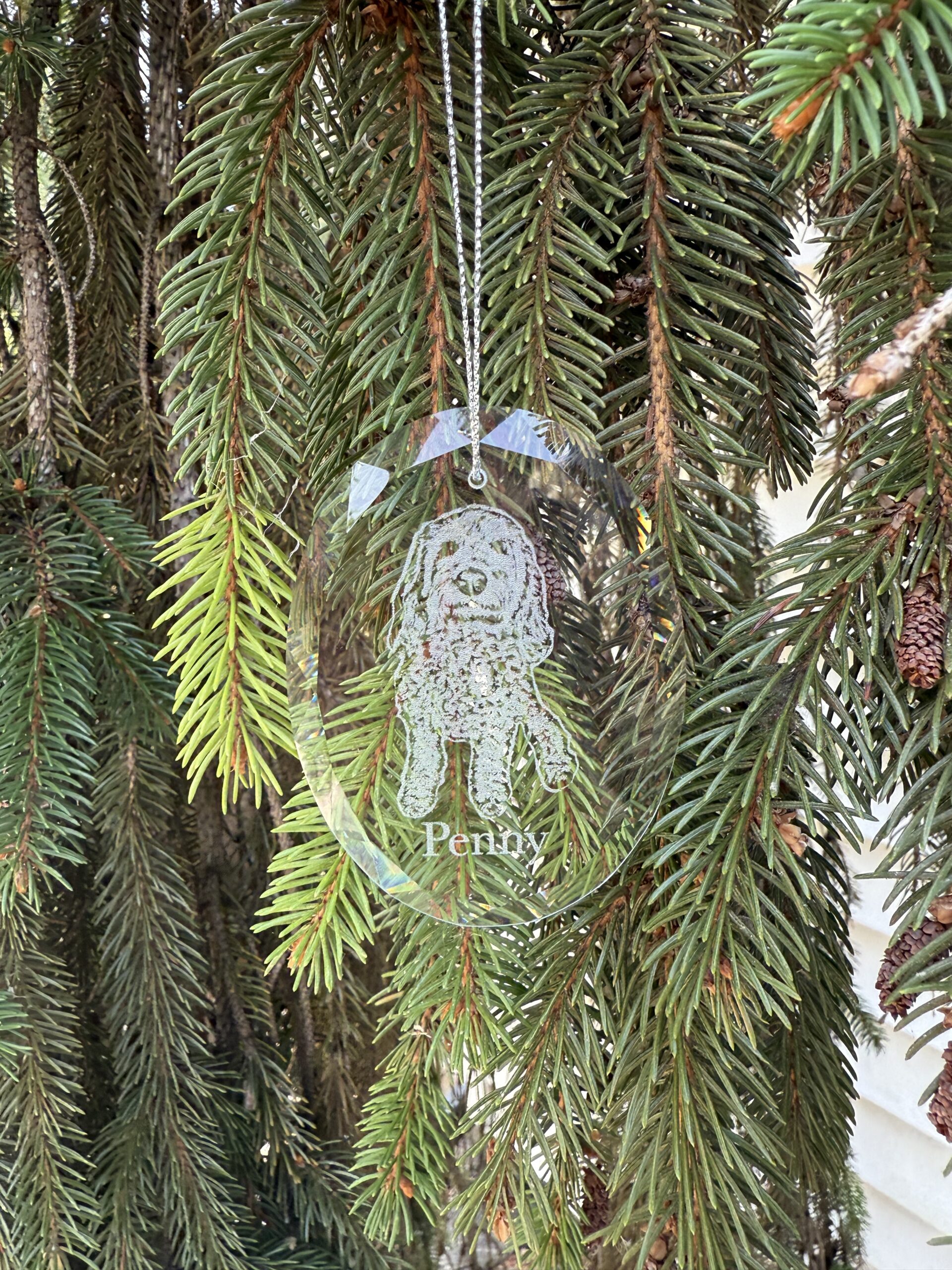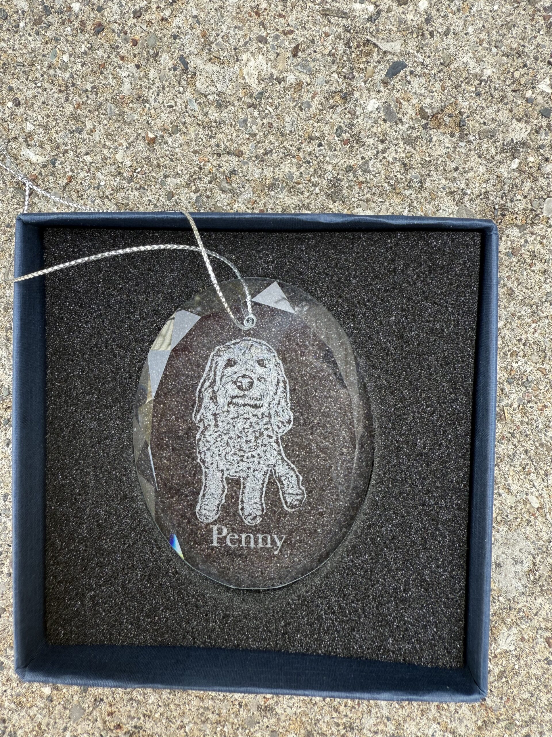 Oval glass ornament. 3″ tall. Upload a picture of your dog/cat/any pet and their name. This is the perfect heirloom piece to gift to an animal lover or as a keepsake if your fuzzy friend passes away.