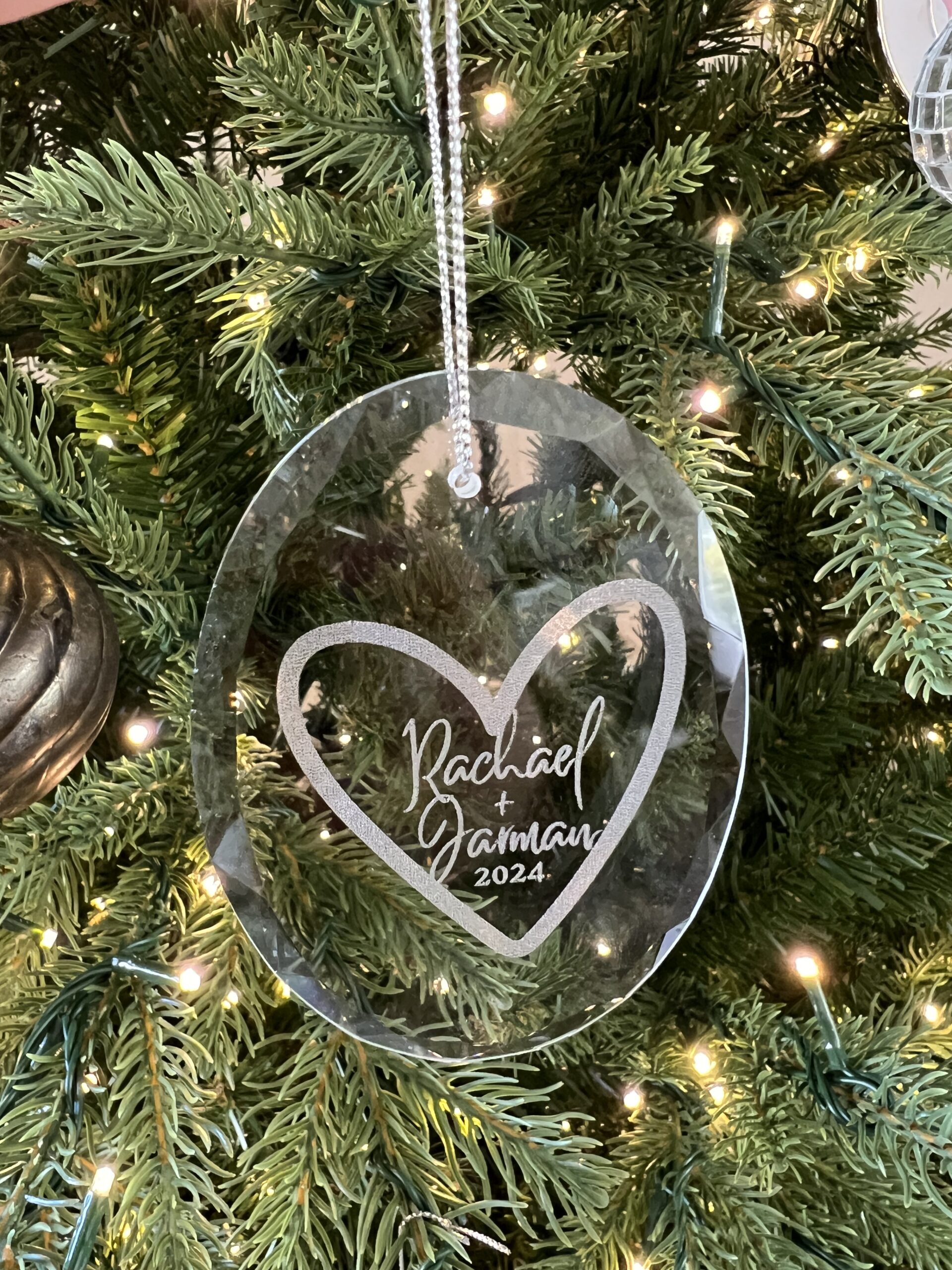 Oval glass ornament. 3″ tall. You choose what you want engraved: custom design, handwritting, a special photo.
