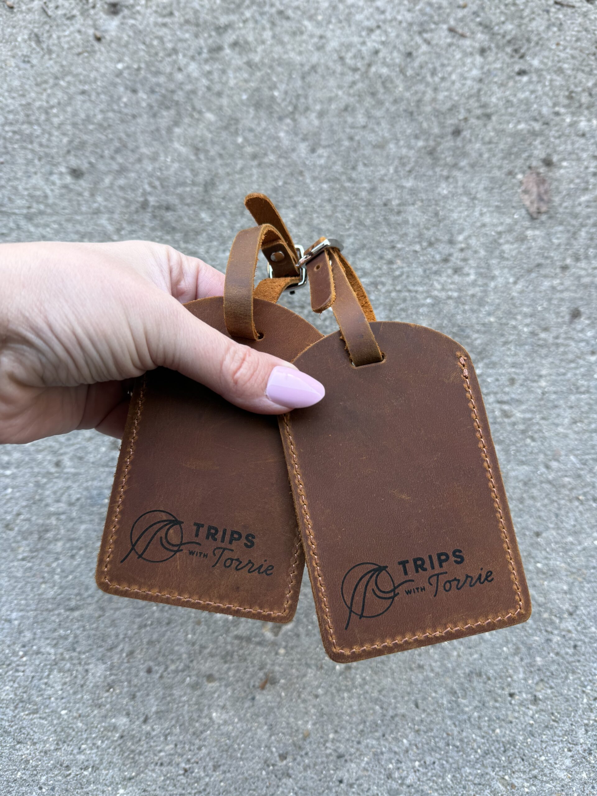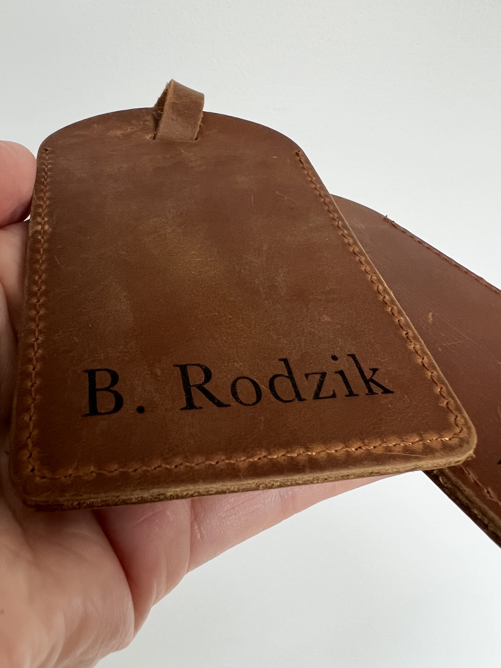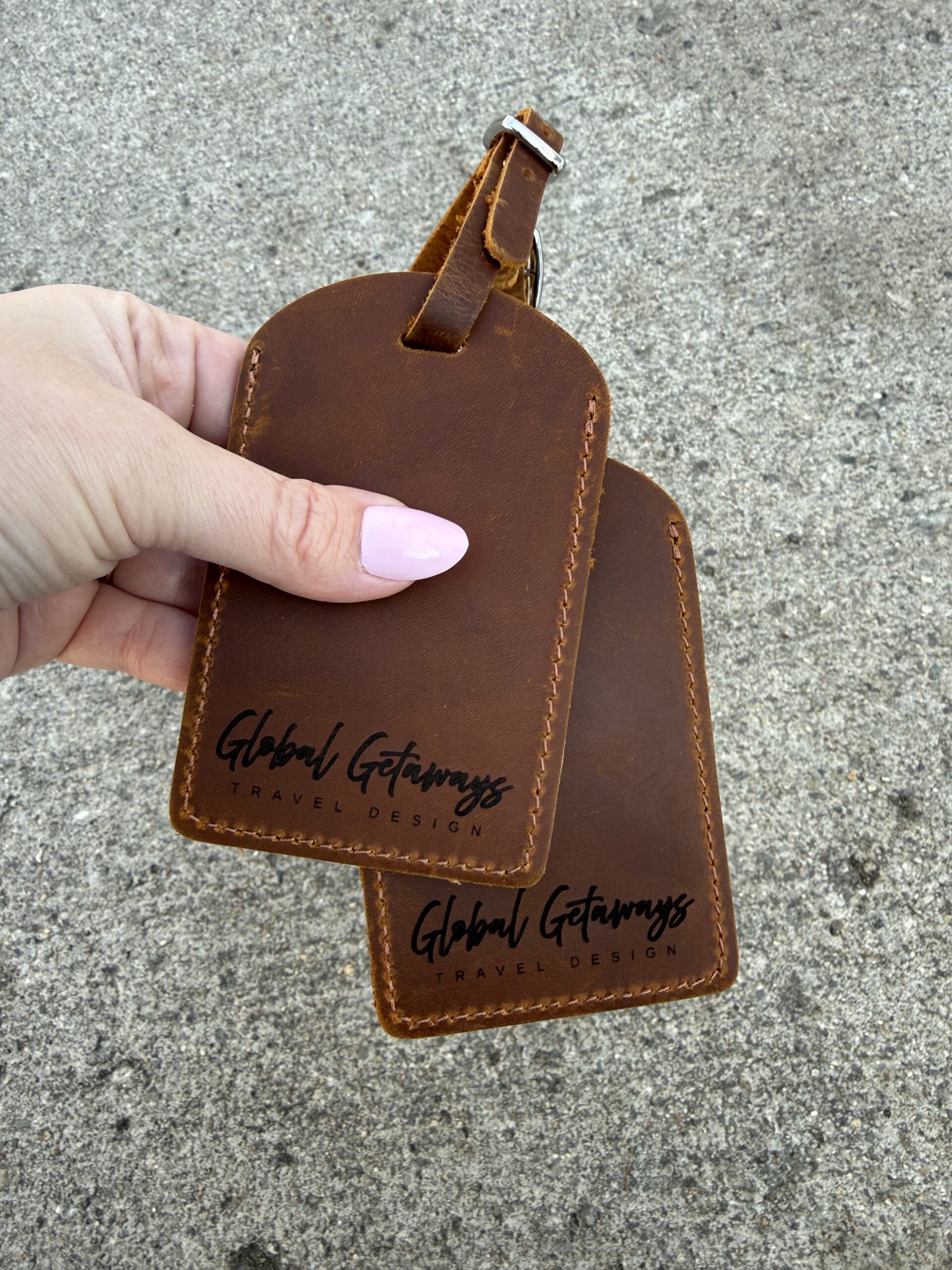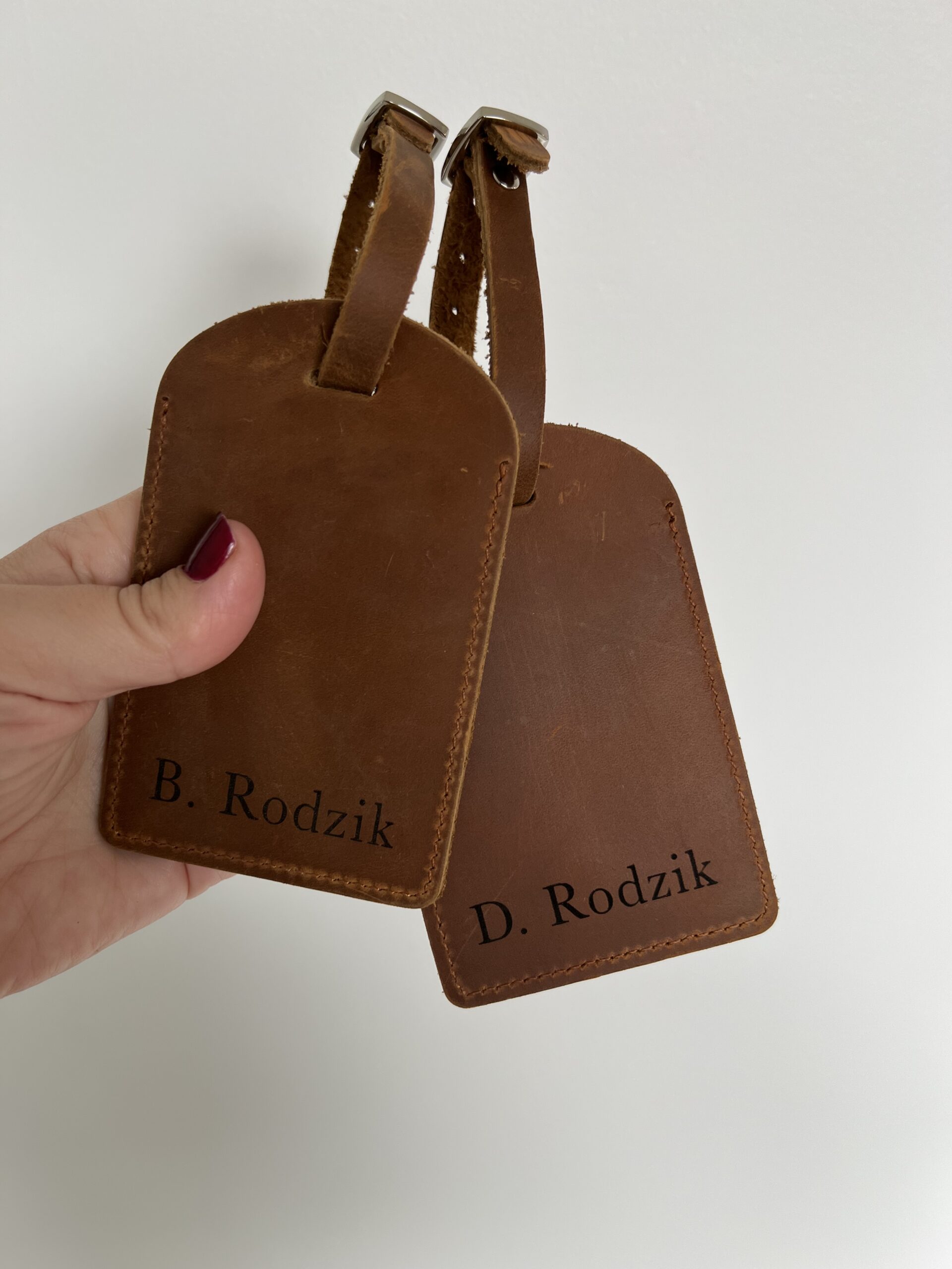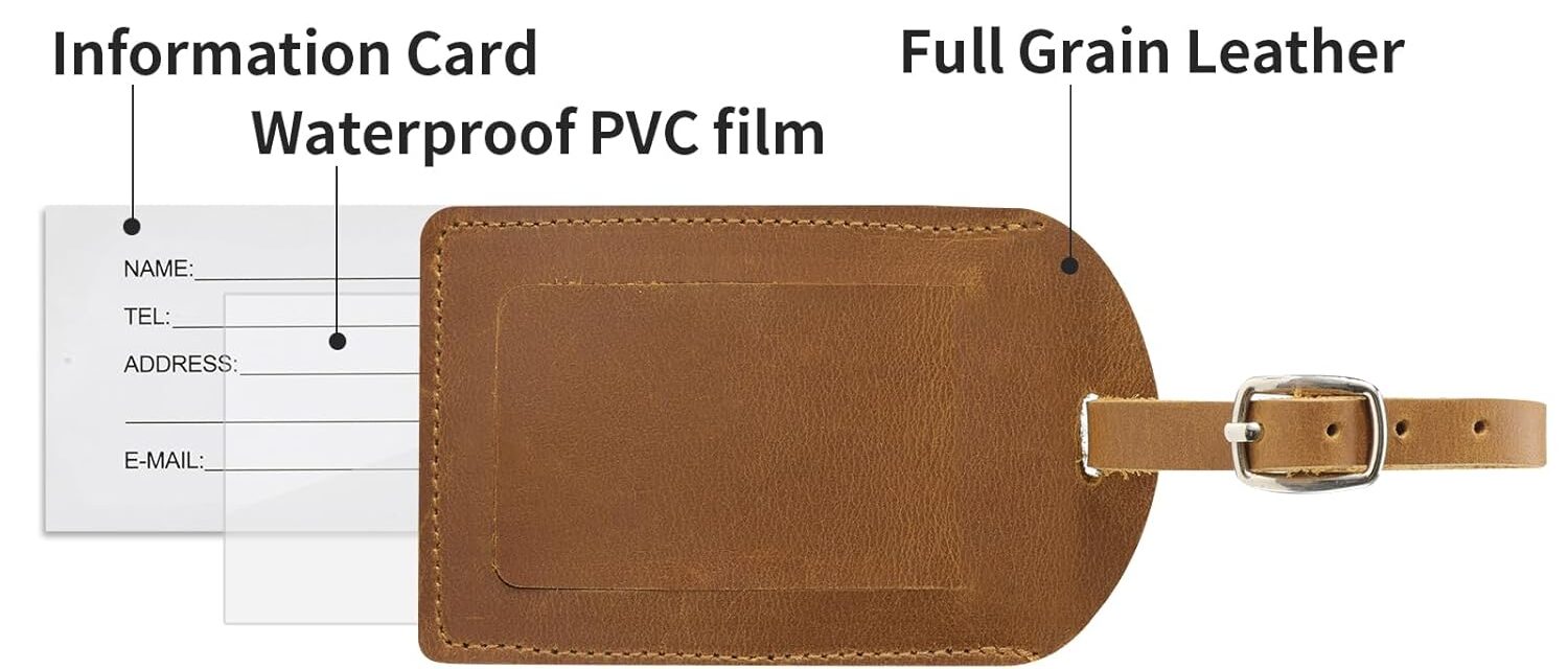 4.7″x2.8″ genuine leather luggage tag with silver buckle. Perfect for a high end look for your luggage when you travel.