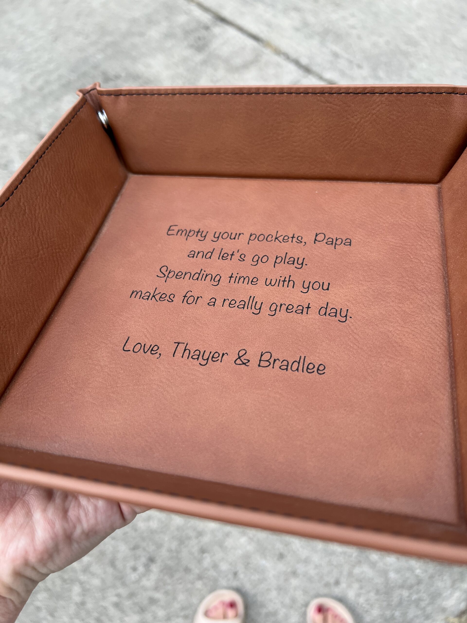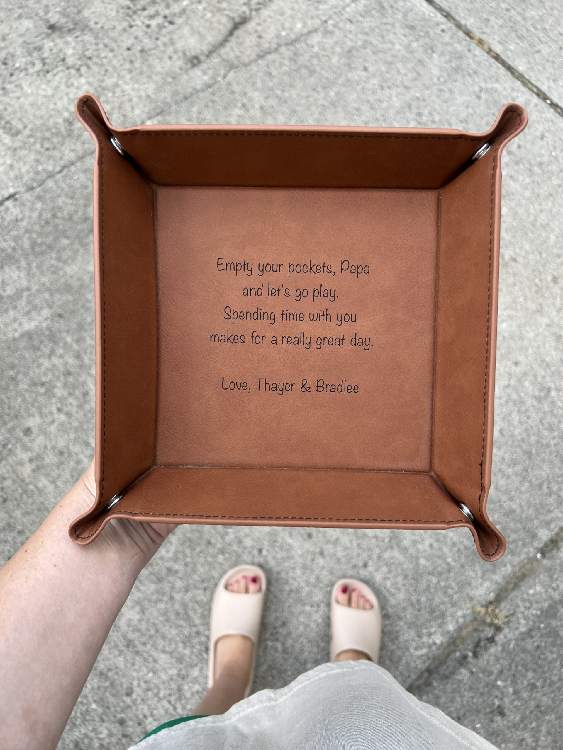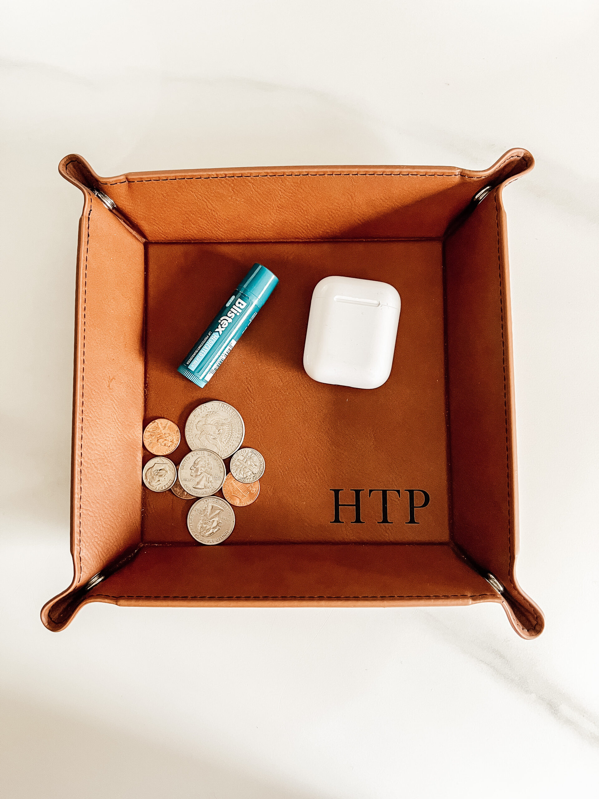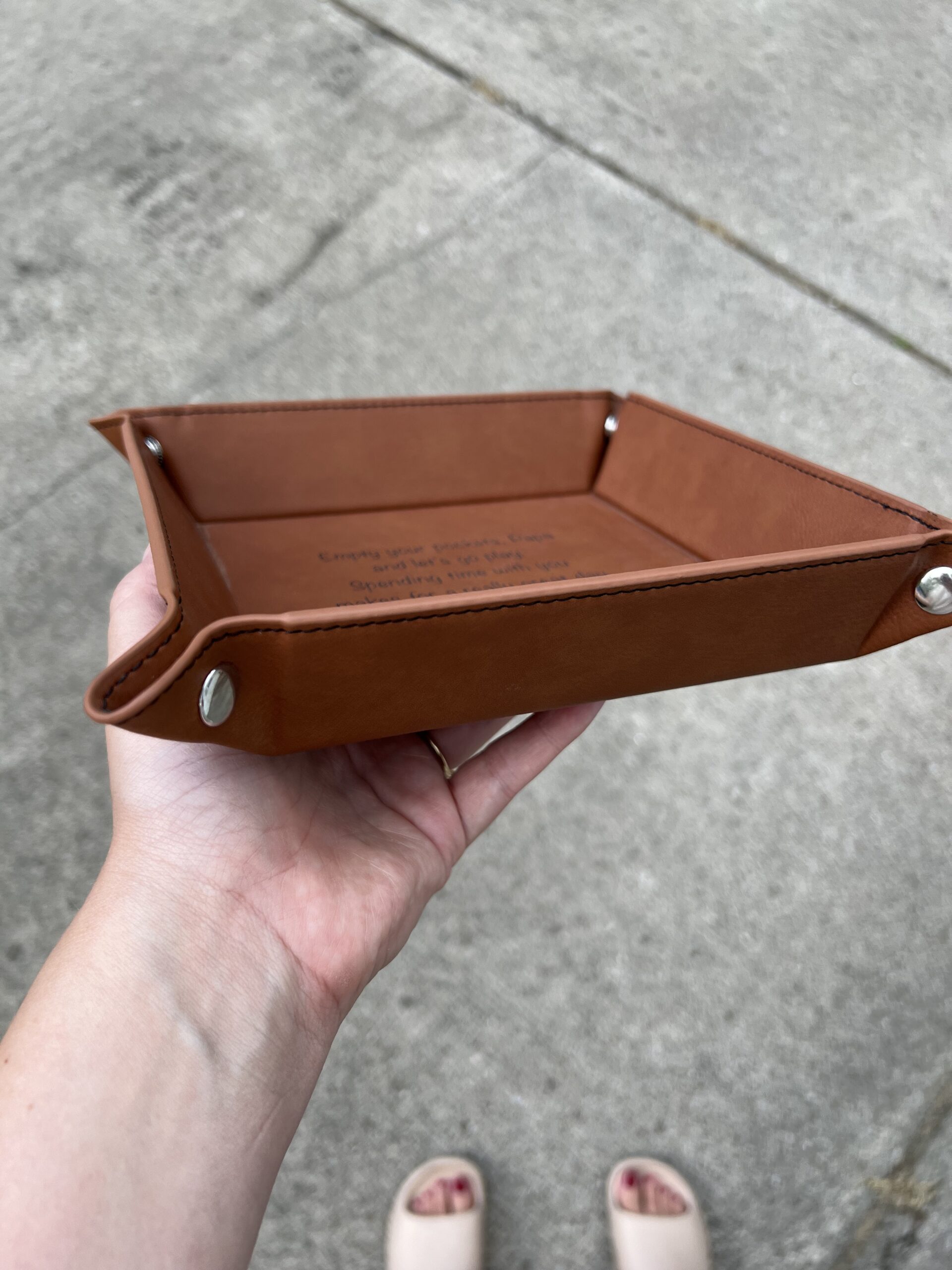 Leatherette 6″x6″ snap up catch-all tray. Color options: dark brown, black, grey, red, blue, pink, white, rawhide.