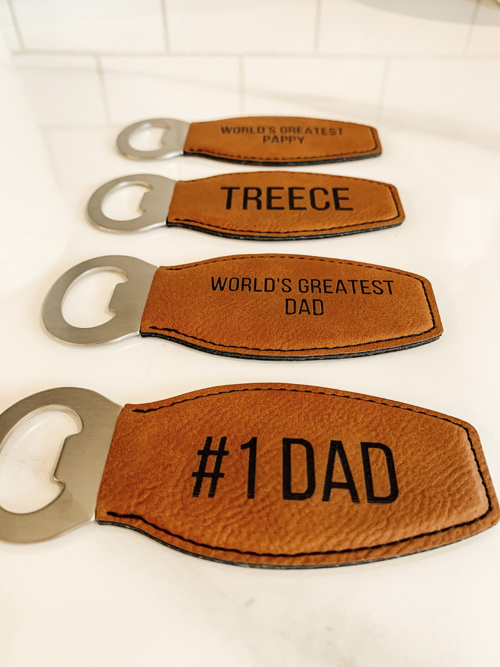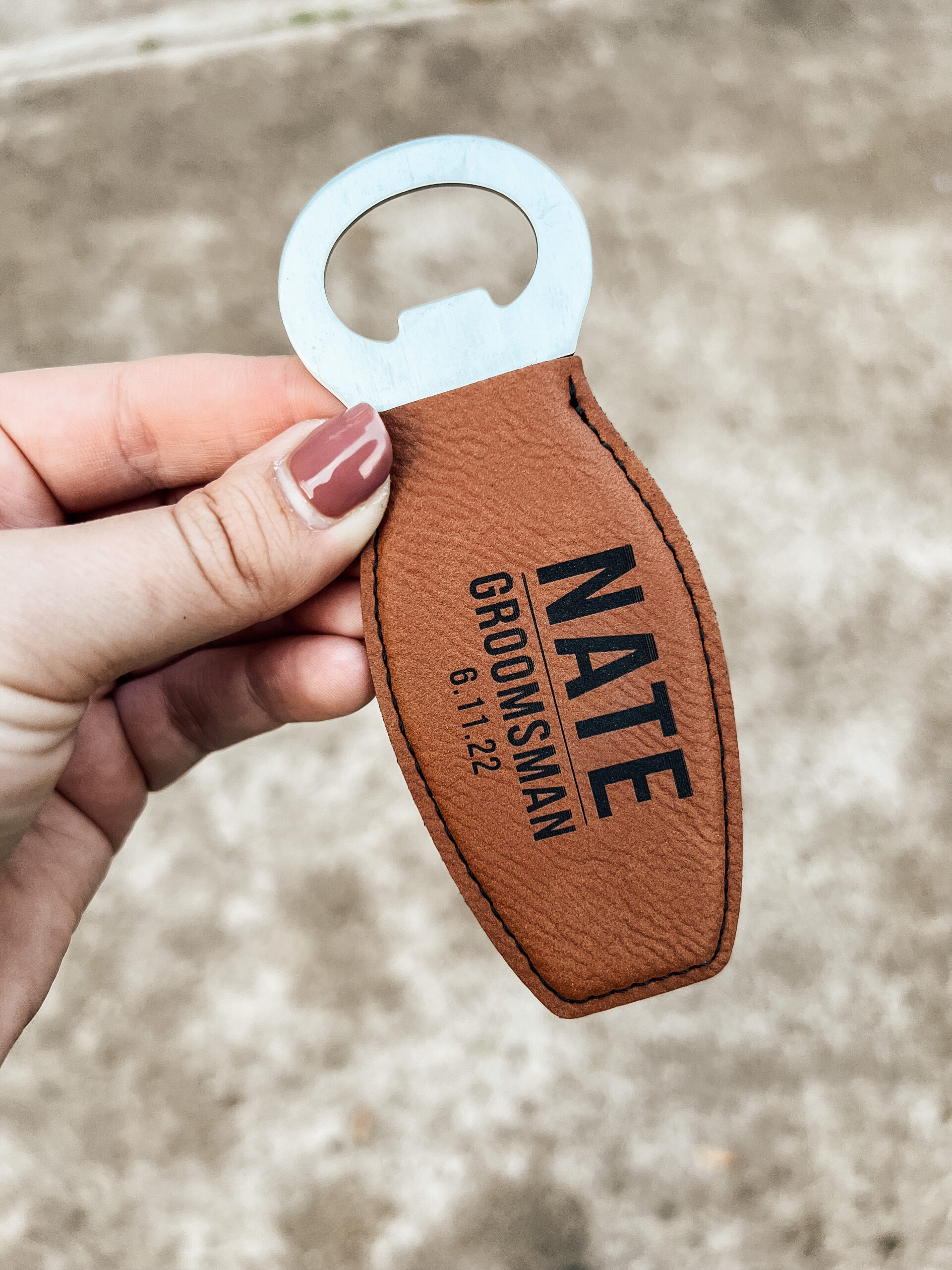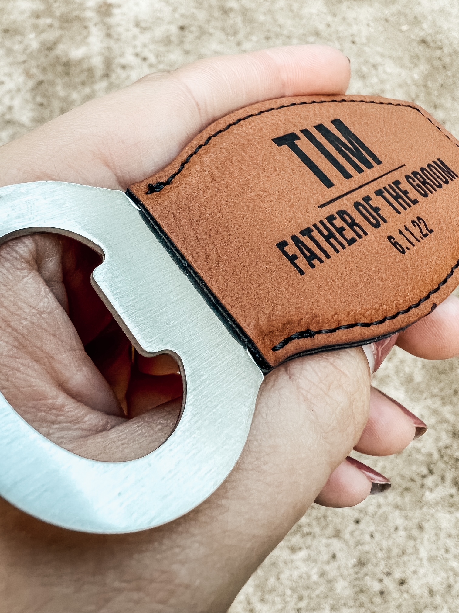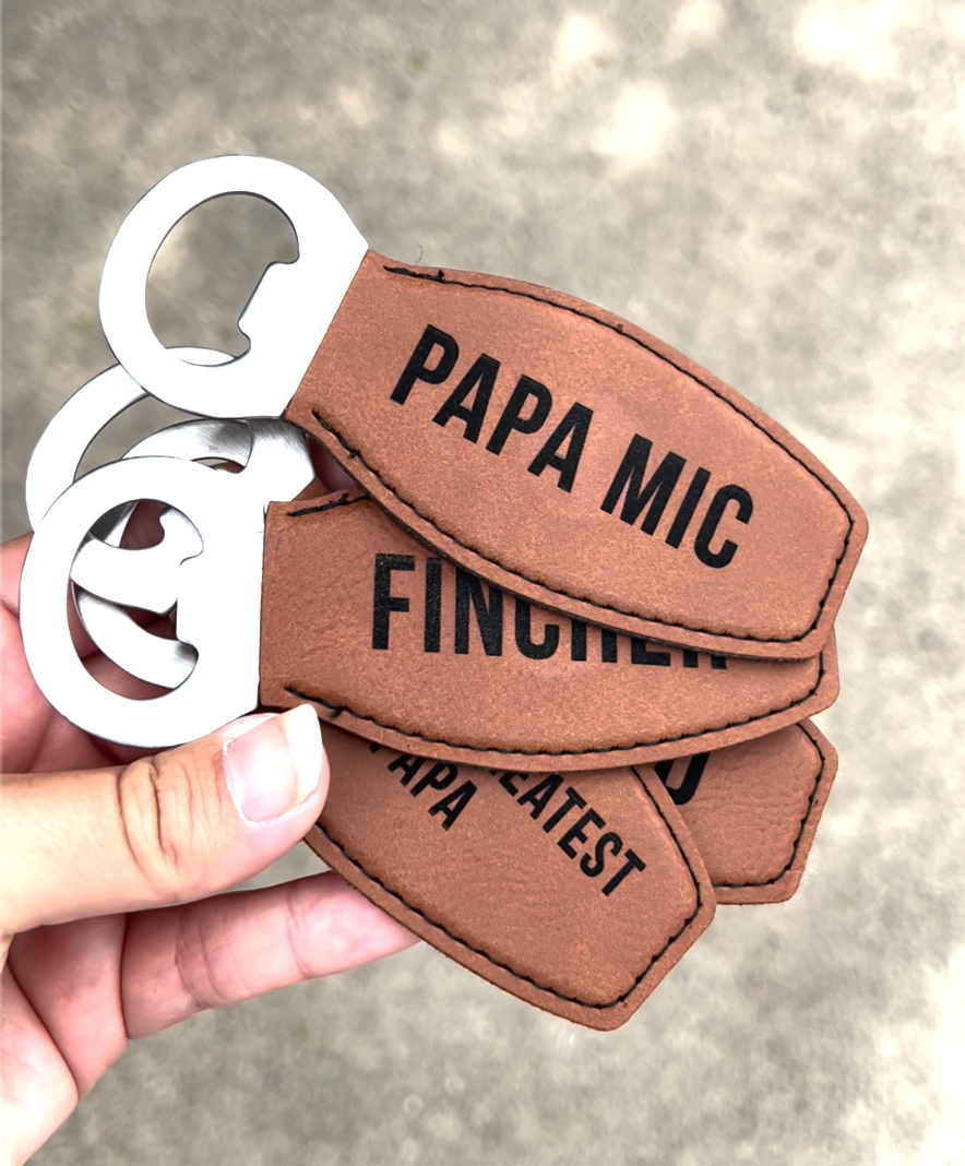Magnetic bottle opener – set of 4. Roughly 4″ x 1.75″. Color options: rawhide (shown in main photo), black, dark brown, light brown, grey, pink.