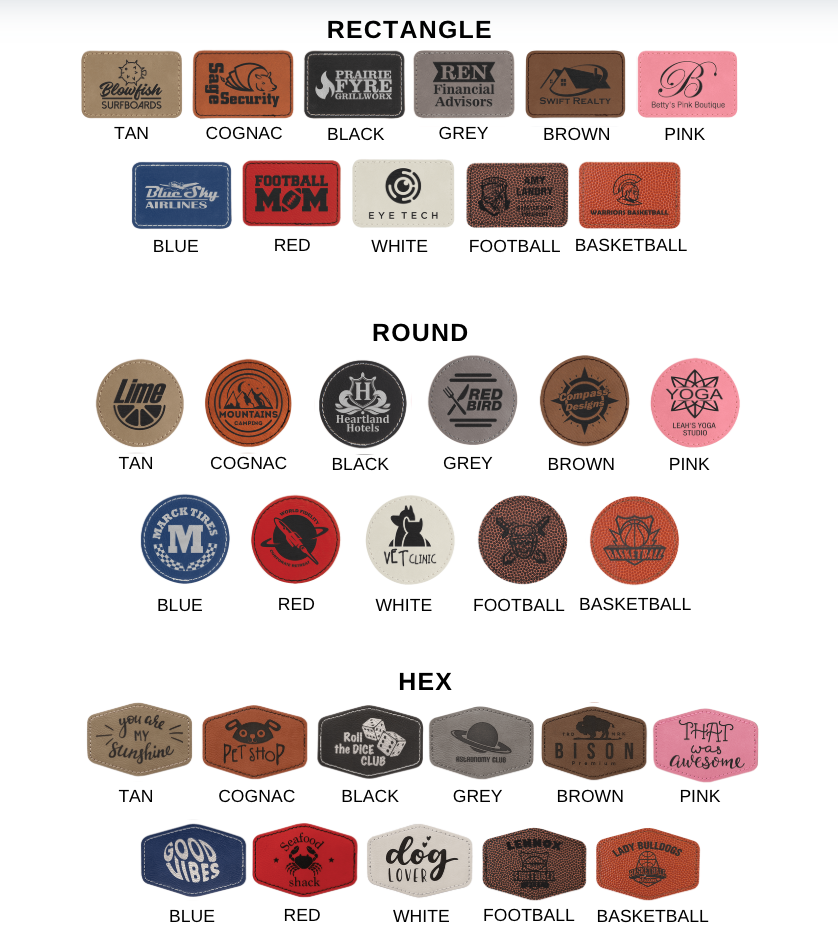 Patch colors: dark brown, cognac, tan, black, grey, pink, blue, red, white, football texture, basketball texture