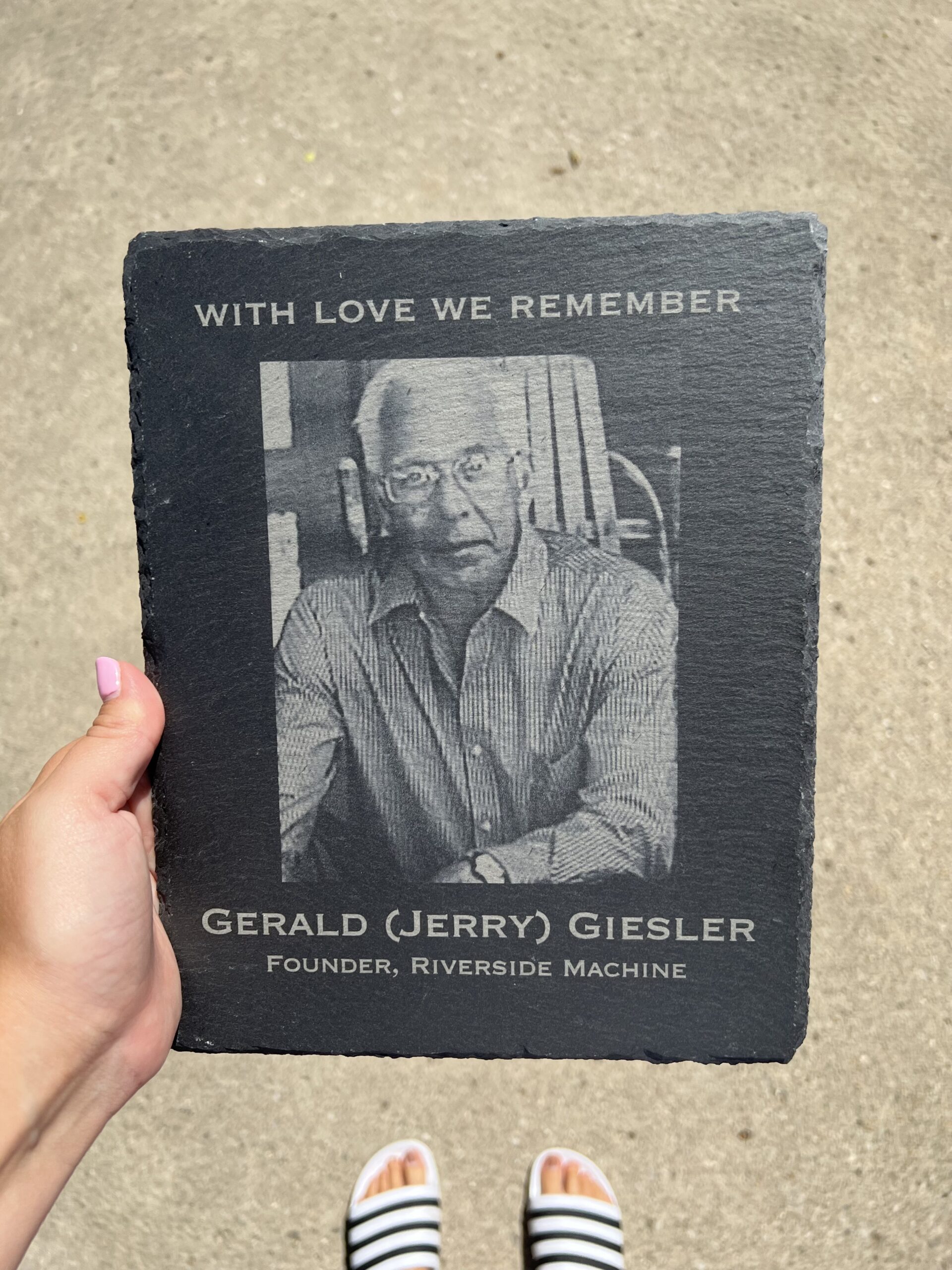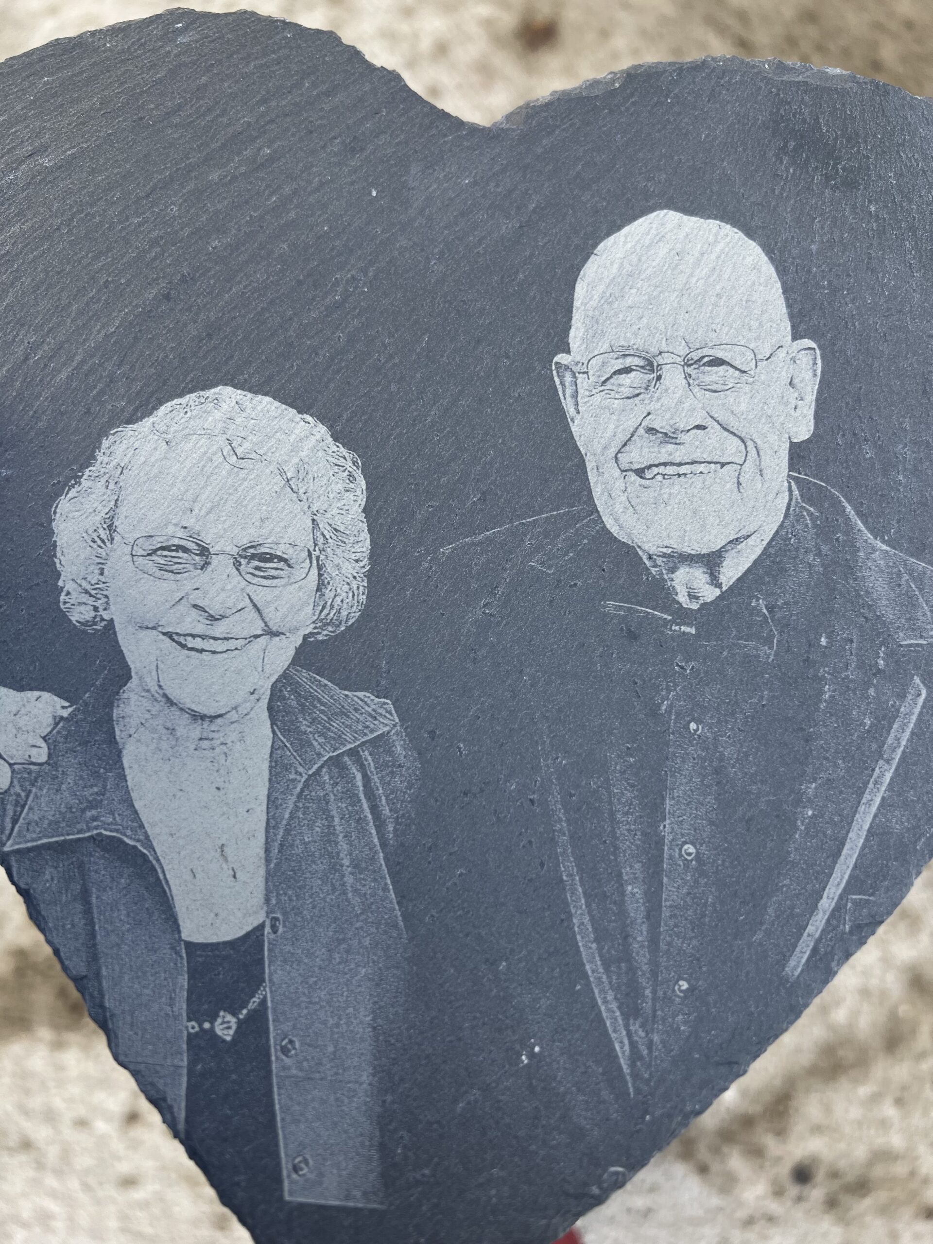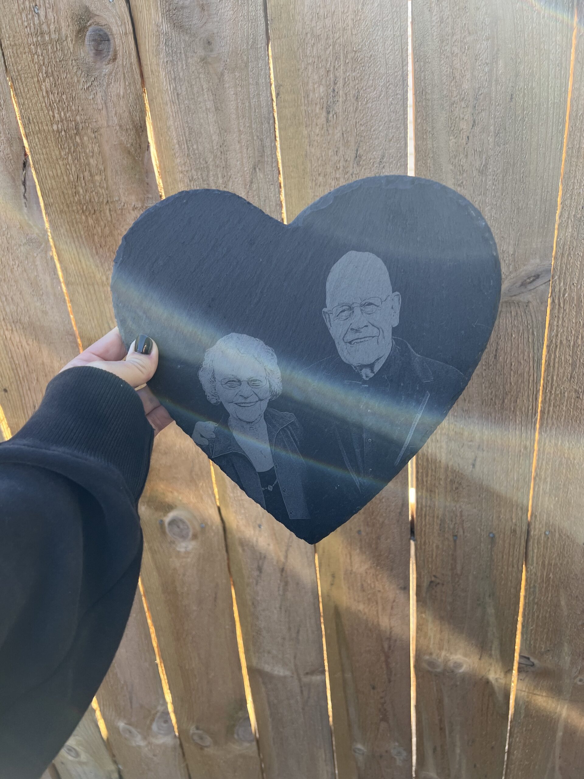 8″x10″ rectangle or 10″ heart slate memorial plaque. The edges are organically cut and vary piece to piece.